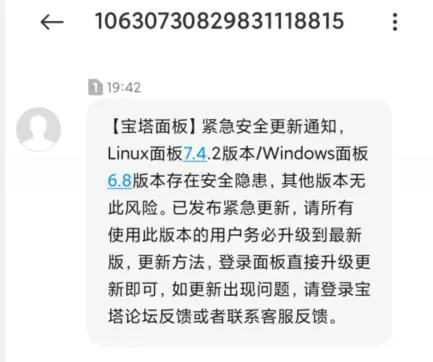 最后,在下午7点30分左右,官方发布的更新,来修复这个漏洞,并发短信通知了所有正在使用宝塔的用户。